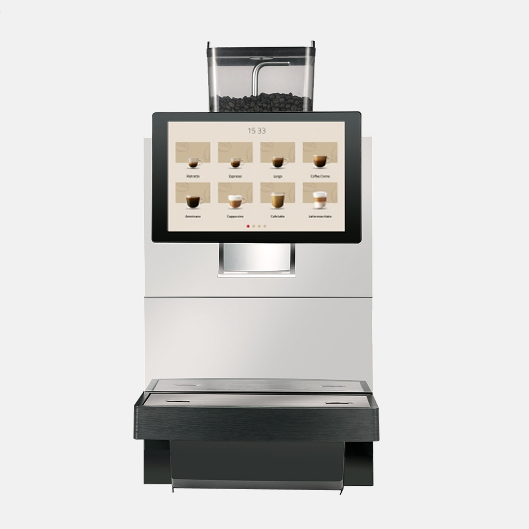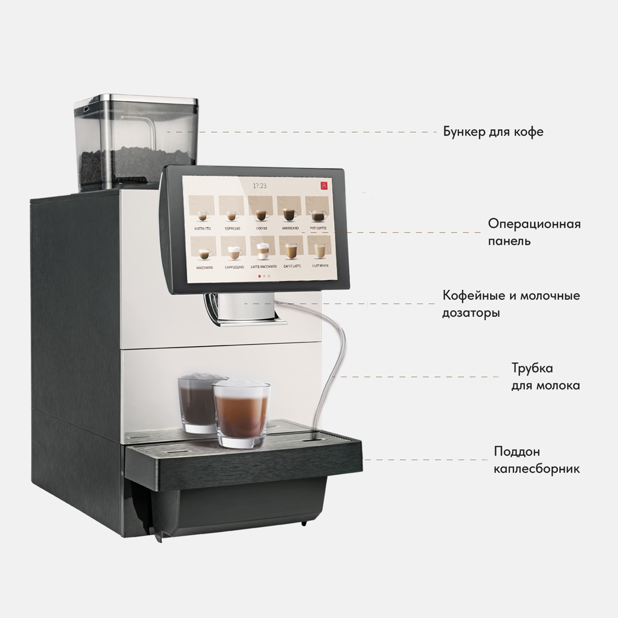 и молоко, горячую воду и кофе. Оснащённая 10-дюймовым цветным сенсорным дисплеем, эта кофемашина чрезвычайно удобна в управлении и предлагает на выбор более 20 напитков. Благодаря совершенно новому дизайну она выглядит элегантно и атмосферно.